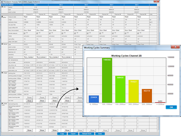 SCPs 的直观化用户界面(GUI)能够对测量模块配置、传感器数据和操作时间等所有关键数据进行概览,因此,可以在单个屏幕上进行所有更改,以便简单、快速地处理数据。“导出”功能可将相关数据转换成多种格式,以记录所有测量设置。用户点击按钮,即可创建每个缸压传感器的峰值压力柱状图,从而用户能立即检测到传感器数据及其异常值。